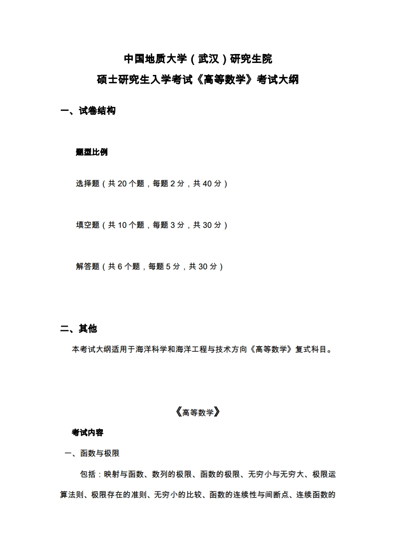 中国地质大学考研辅导班: 中国地质大学(武汉)2020年《高等数学》考试大纲(适用于地质工程专业硕士生复试加试)