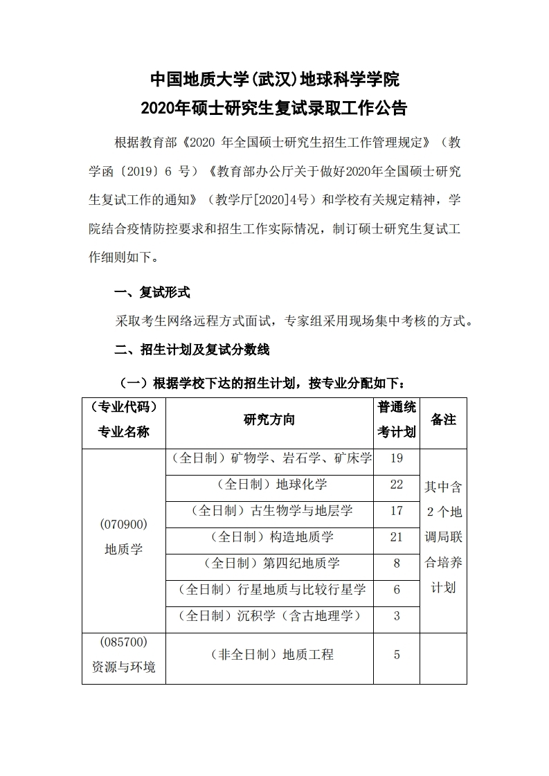 中国地质大学考研辅导班: 中国地质大学(武汉)地球科学学院2020年硕士研究生复试录取工作公告