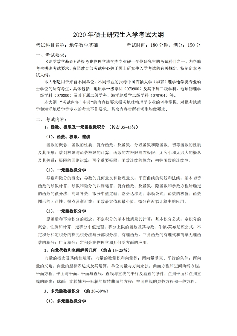 中国石油大学考研辅导班:中国石油大学(华东)601地学数学基础2020年硕士研究生考试大纲、参考书目