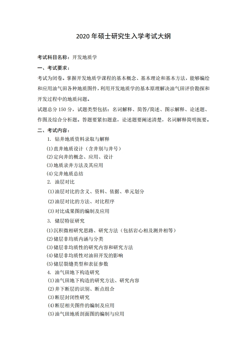 中国石油大学考研辅导班:中国石油大学(华东)开发地质学2020年硕士研究生考试大纲、参考书目