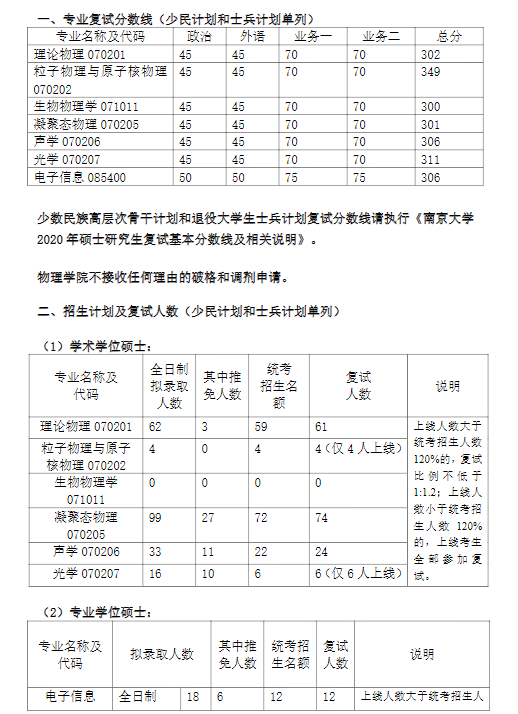 南京大学考研辅导班:南京大学物理学院2020年硕士研究 生复试分数线、复试人数