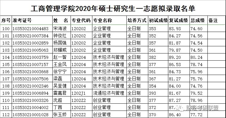 浙工商靠考研辅导班:2020年浙江工商大学工商管理学院硕士研究生拟录取名单