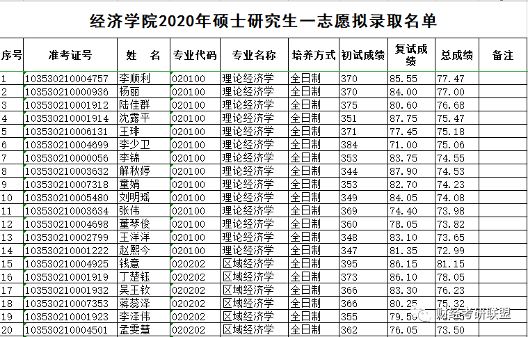 2021年浙工商考研辅导班:2020年浙江工商大学经济学院硕士研究生拟录取名单
