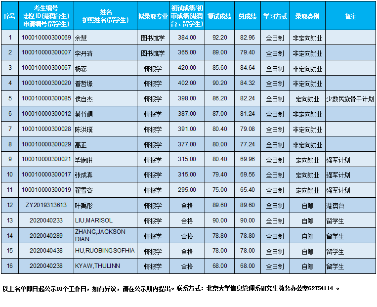 北京大学信息管理系2020年考研拟录取公示名单