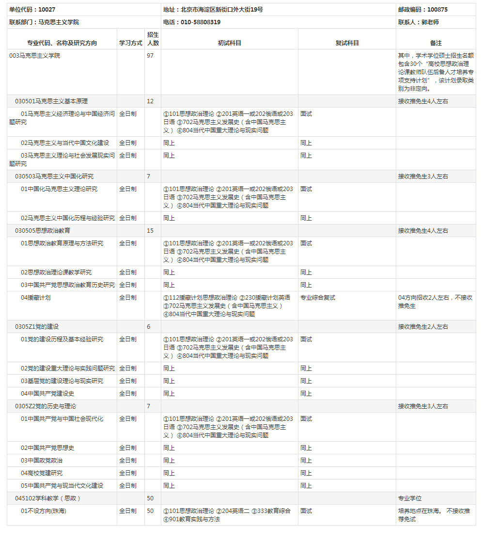 北京师范大学是全国最早系统建设马克思主义理论学科的高校之一。新中国成立后,即成立专门机构,开设相关课程。进入改革开放新时期后,成为全国第一批研究生学位授权单位。1981年首批获得辩证唯物主义和历史唯物主义、政治经济学、中共党史等硕士学位授予权;1986年获得中共党史博士学位授予权,1998年获得马克思主义理论与思想政治教育博士学位授予权;2003年设立政治学博士后科研流动站,2006年首批获得马克思主义理论一级学科博士学位授予权,2012 年设立马克思主义理论博士后科研流动站。