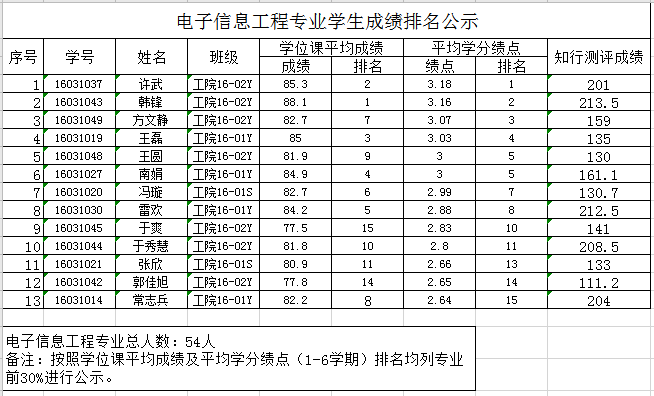 电子信息工程专业学生成绩排名公示