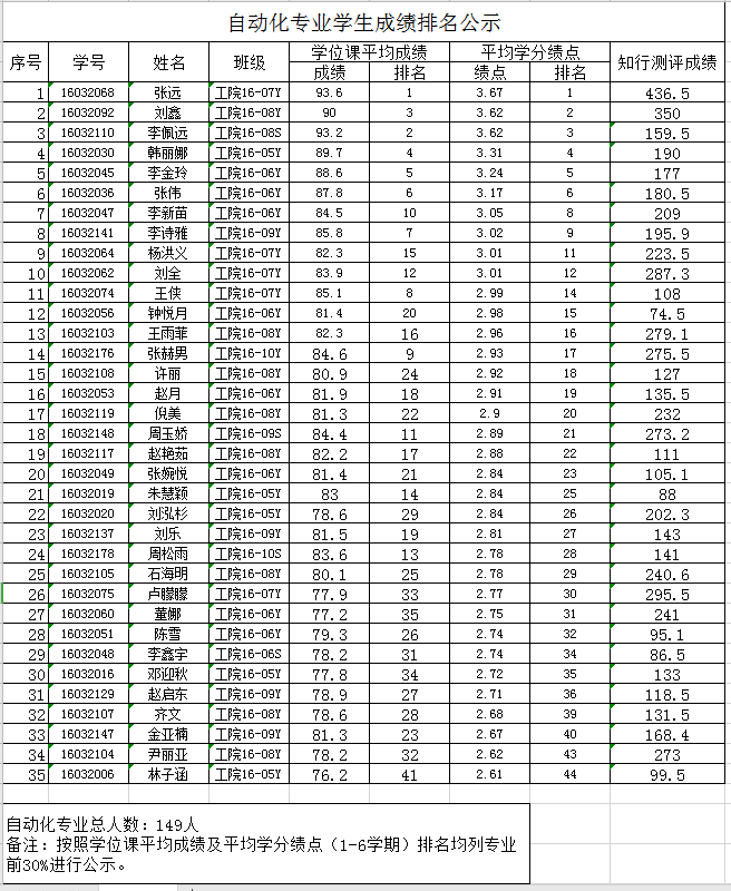 自动化专业学生成绩排名公示