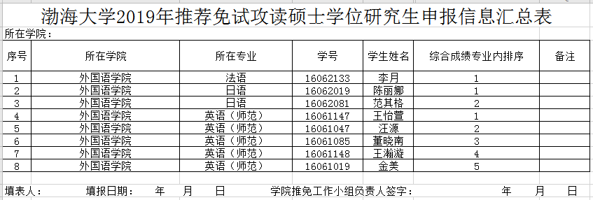 渤海大学2020年外国语学院推免学生综合测评成绩排名