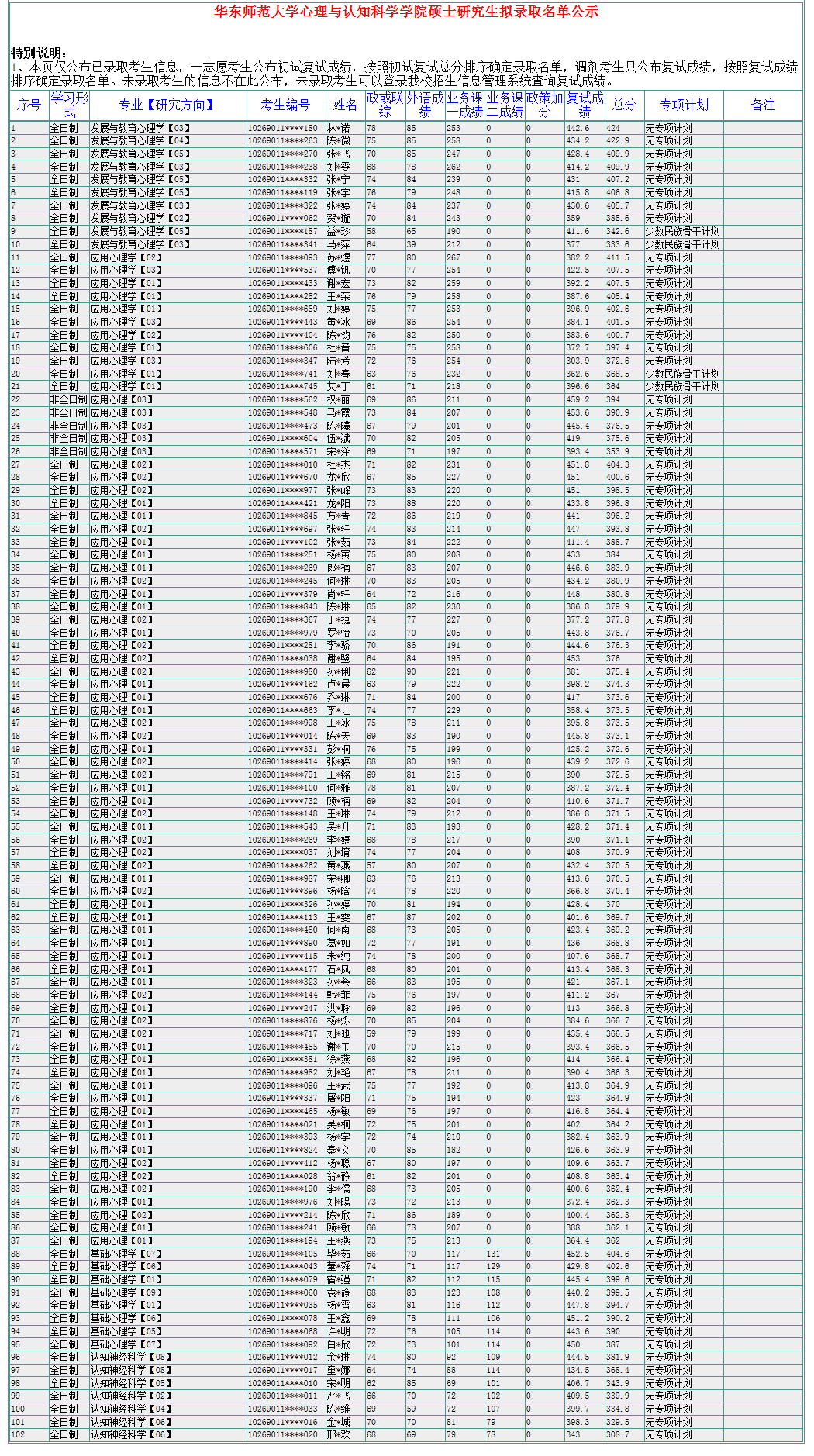 华师大考研辅导班:2020年华东师范大学心理与认知科学学院硕士生考研复试拟录取名单公示
