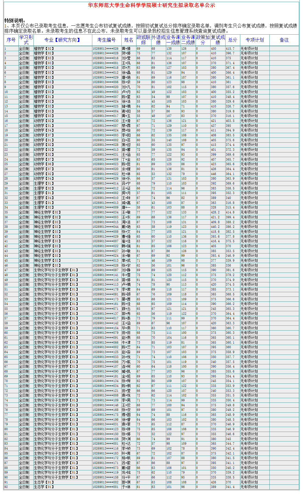 华师大考研辅导班:2020年华东师范大学生命科学学院硕士研究生拟录取名单公示