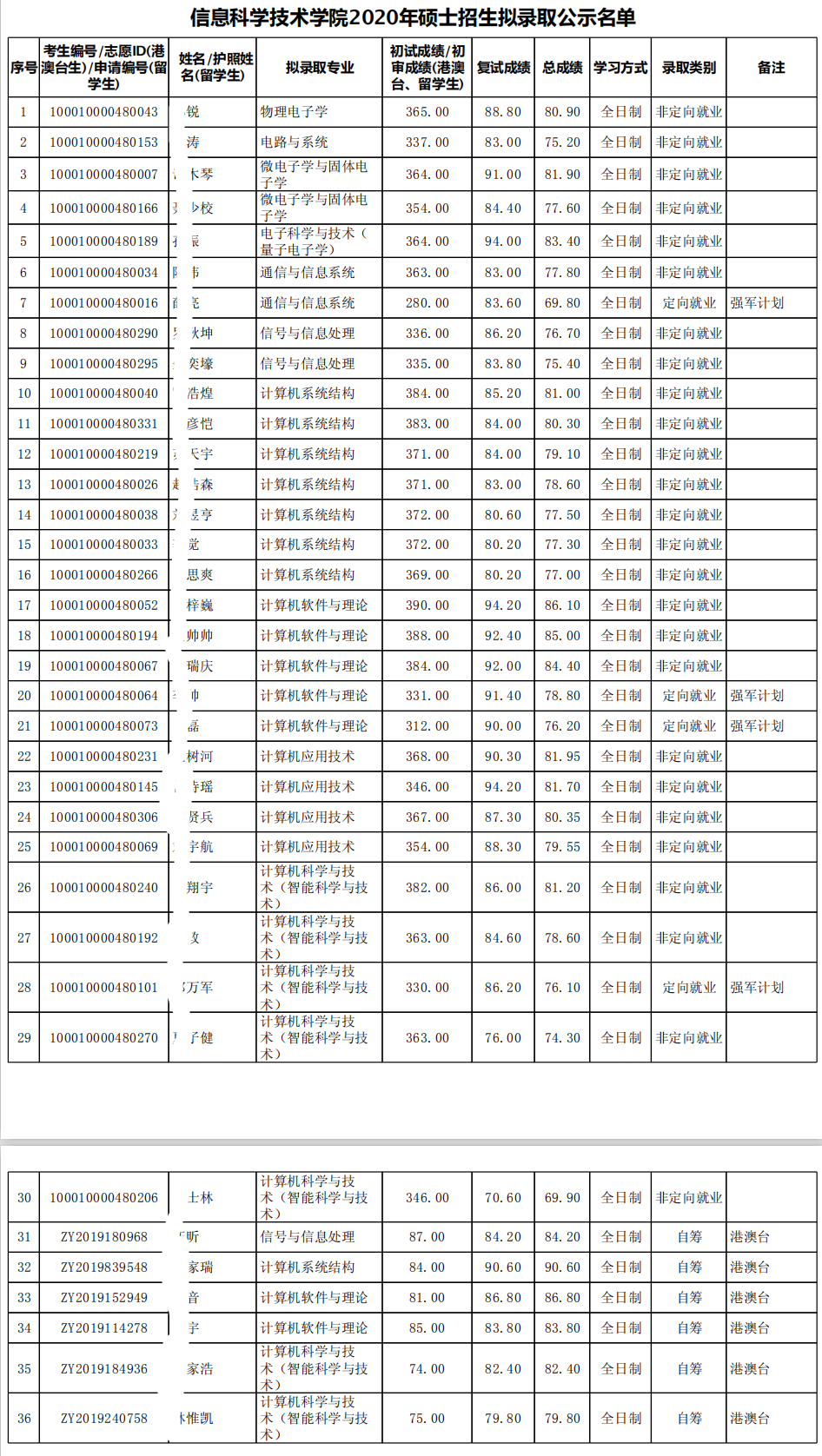 北大考研辅导班:2020年北大信息科学技术学院硕士招生考研复试拟录取公示名单