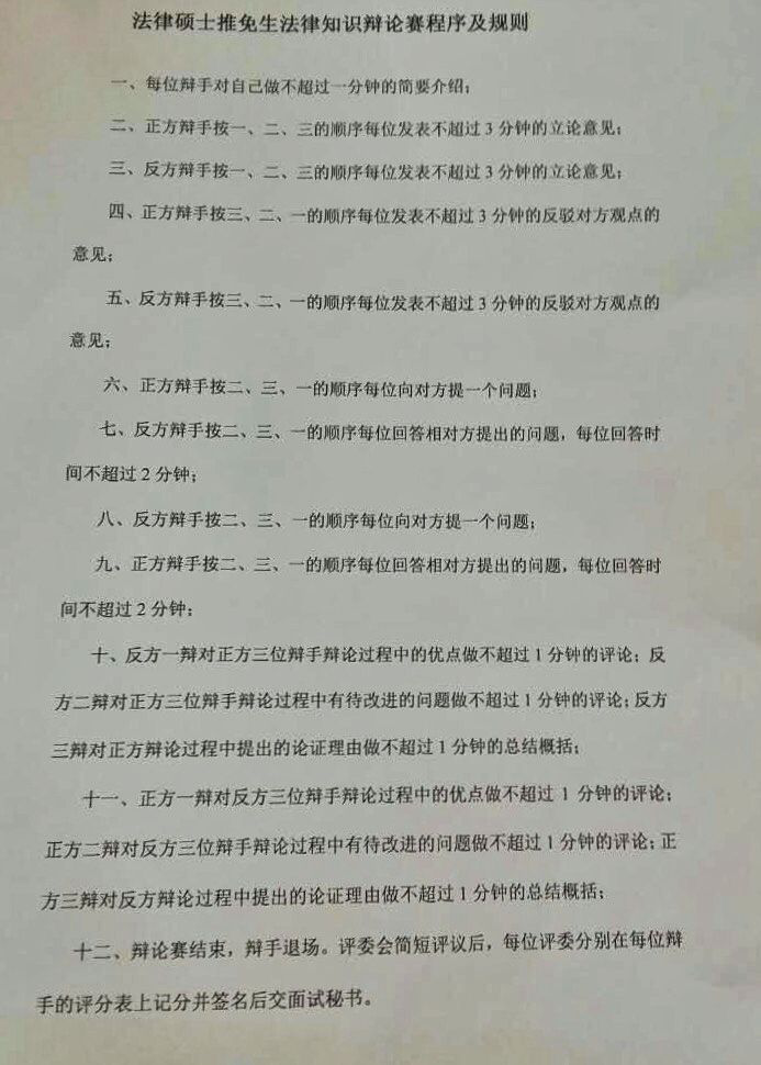 1. 面试靠练习,中文场辩论和英文场都一样。不要被中文场的辩论模式吓到,真的和辩论关系不大,只需要提前熟悉一下发言顺序和规则就可以,辩题基本上准备不到,据我所知有几十个,而且内容大多冷门,不容易准备但是也不至于什么都说不出来,找到自己队员后稍微商量一下,可以相互说好不互相攻击,拿到题目后理理自己的思路,我身边朋友有对于题目完全不了解的情况但是成绩也挺好。我所知道的题目有双重领导是否有利于反腐败、保研是否应该有学术加分、环境保护以人为本还是以自然为本等等,可能与法律有关但更多的是与法律无关的。下表为往年真题。下图为我在网上找到的前年辩论规则。