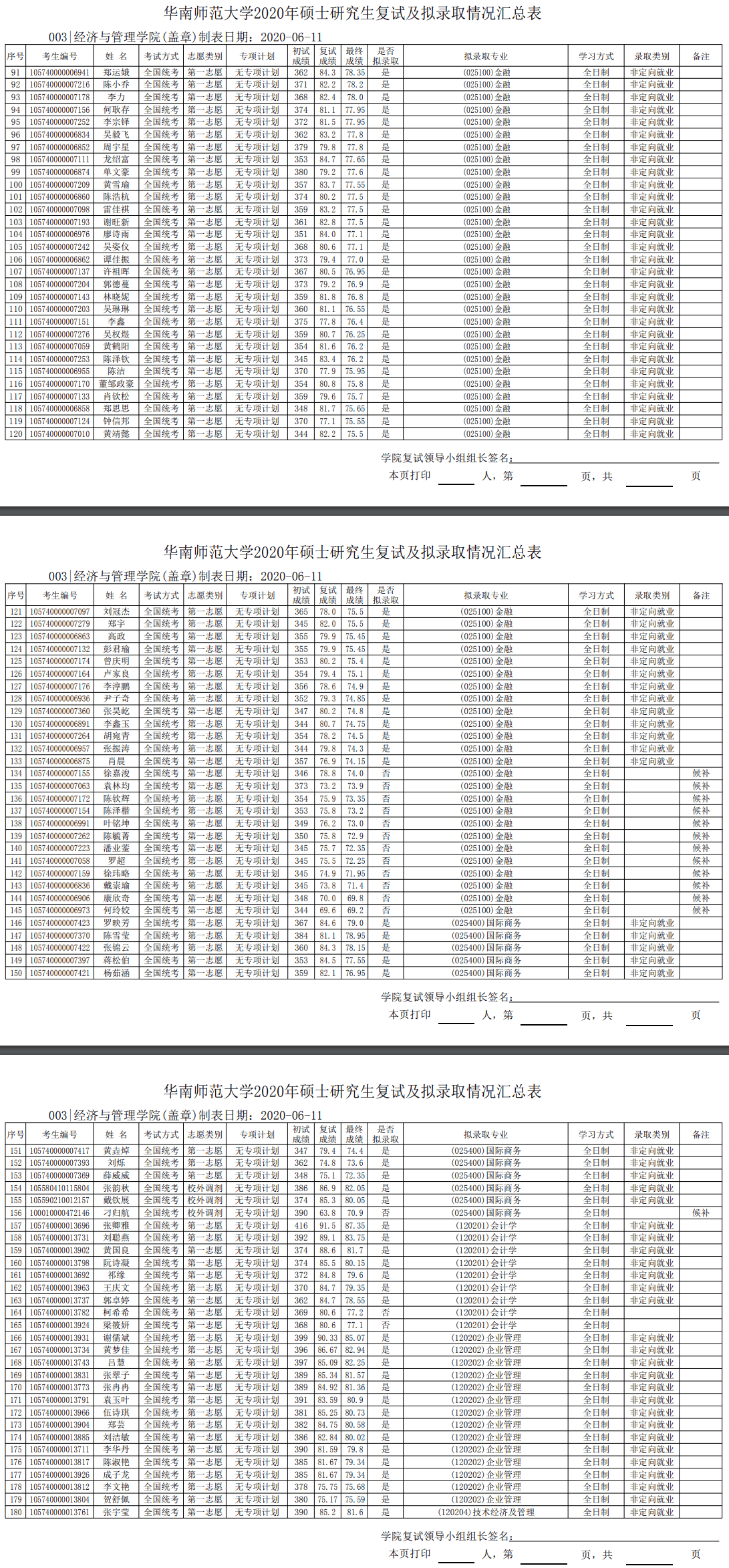 华南师范考研辅导班:2020年华南师范大学经管学院硕士研究生复试成绩及拟录取名单