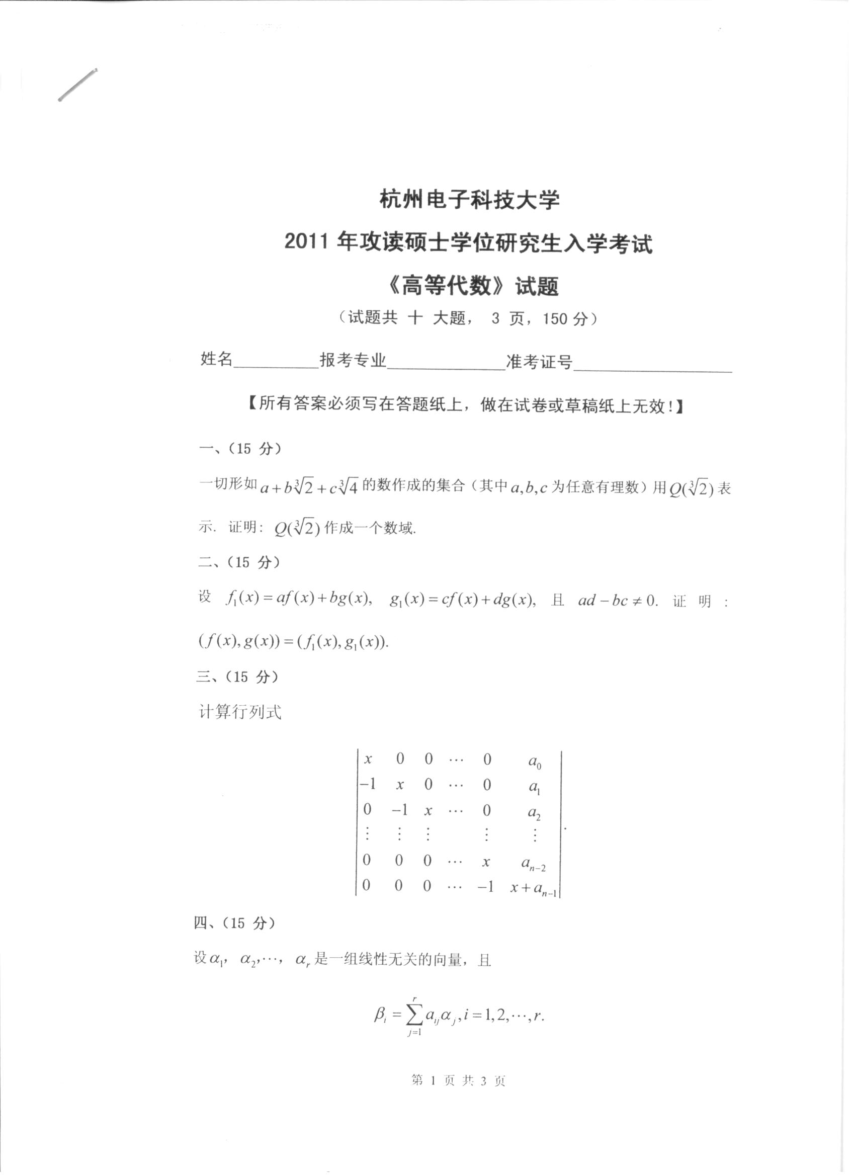 杭州电子科技大学考研辅导班:杭州电子科技大学2011年研究生入学考试高等代数科目考试题目