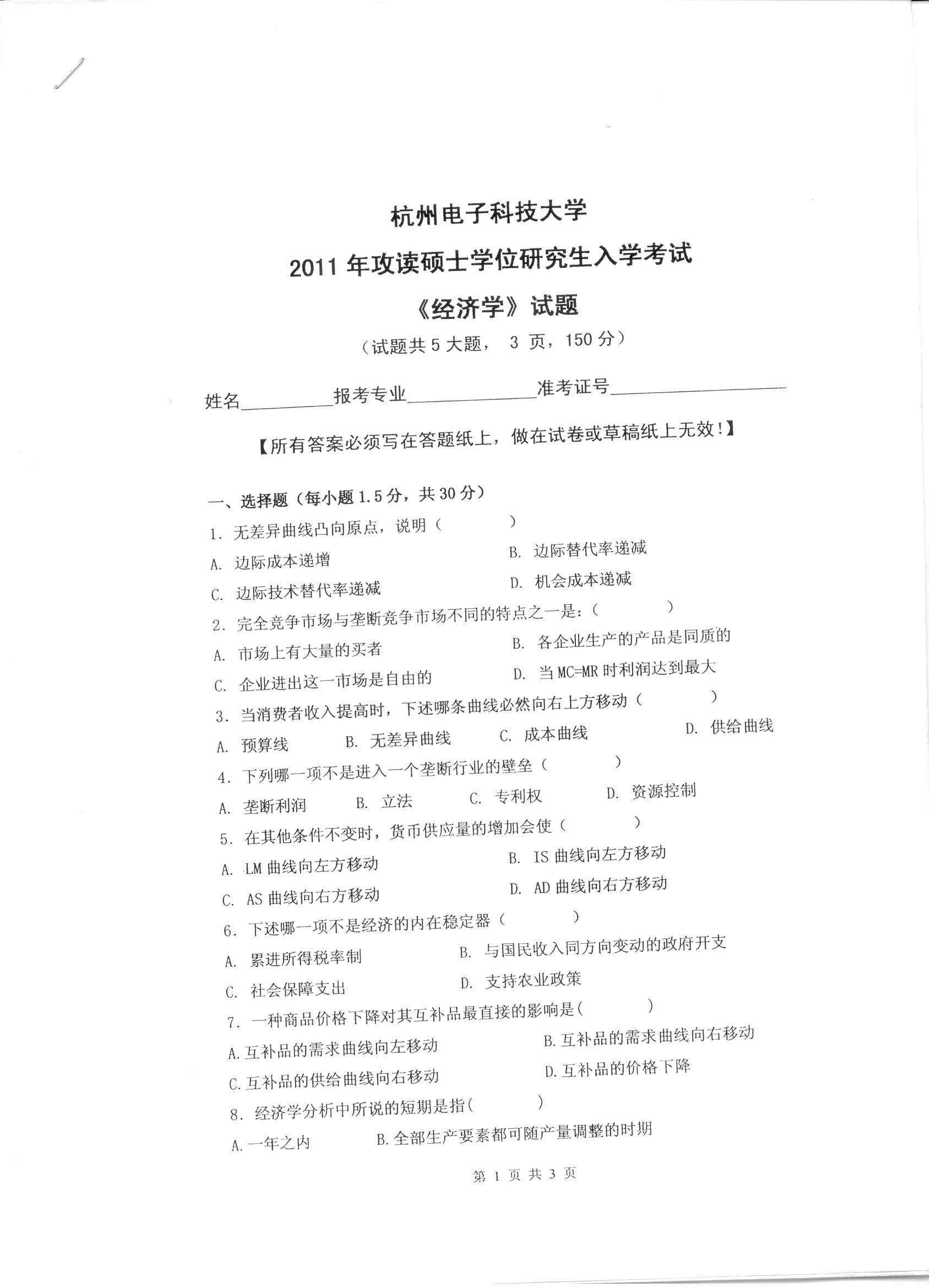 杭州电子科技大学考研辅导班:杭州电子科技大学2011年研究生入学考试经济学科目考试题目