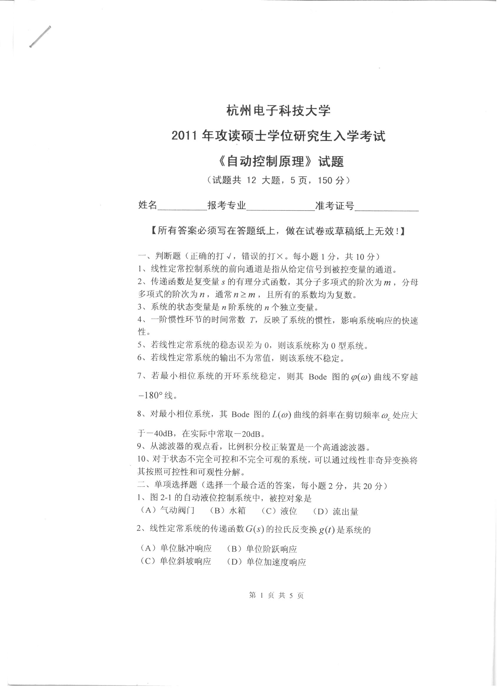 杭州电子科技大学考研辅导班:杭州电子科技大学2011年研究生入学考试自动控制原理科目考试题目