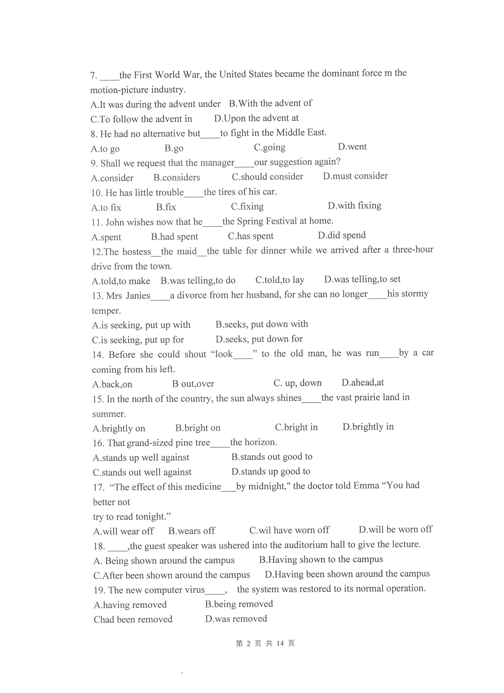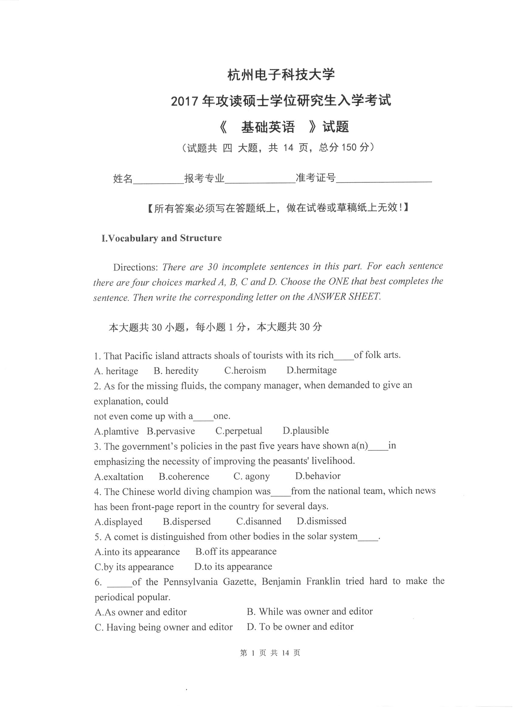 杭州电子科技大学考研辅导班:杭州电子科技大学2017年研究生招生考试基础英语科目考试题目