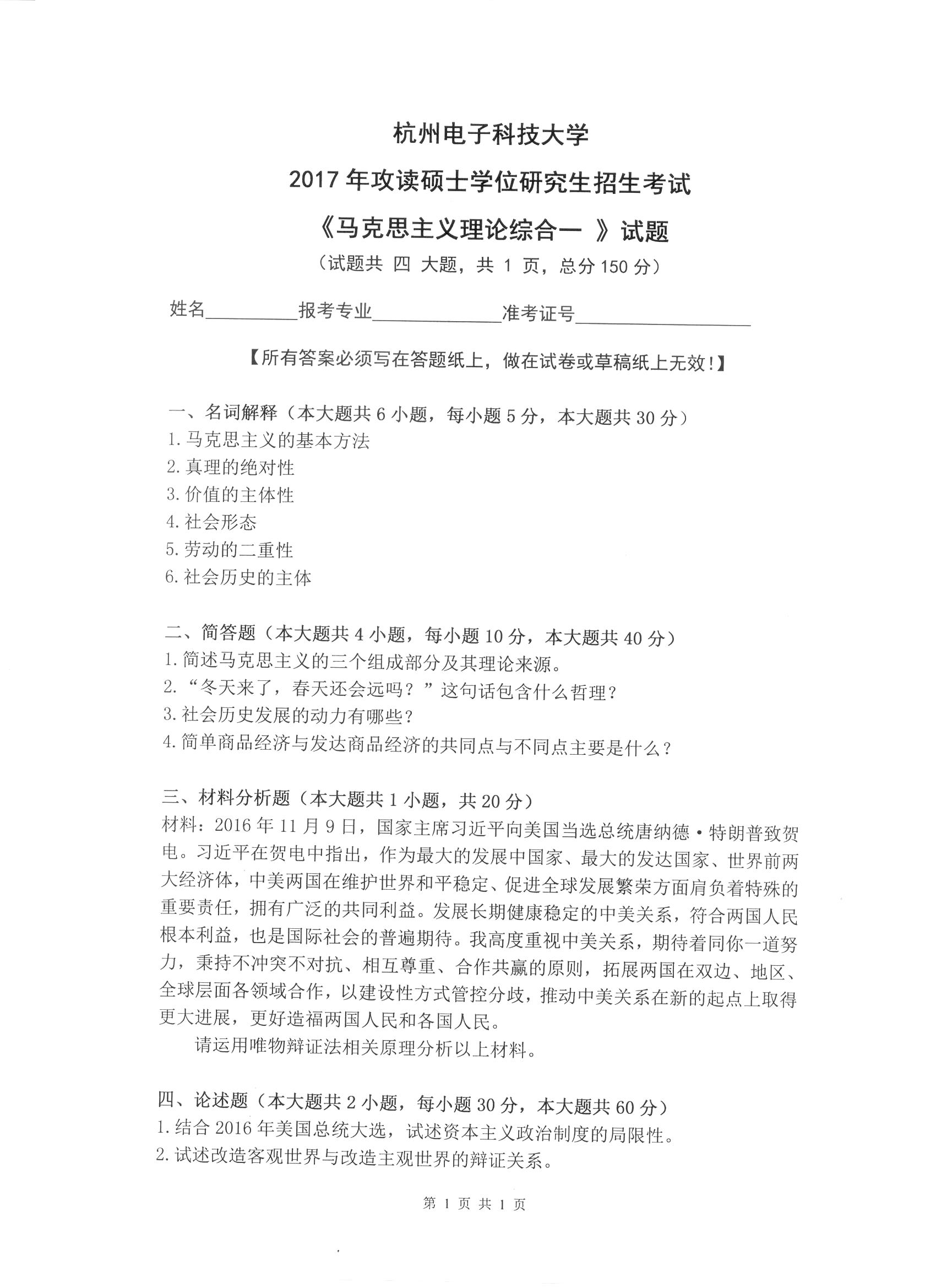 杭州电子科技大学考研辅导班:杭州电子科技大学2017年研究生招生考试马克思主义理论综合一科目考试题目