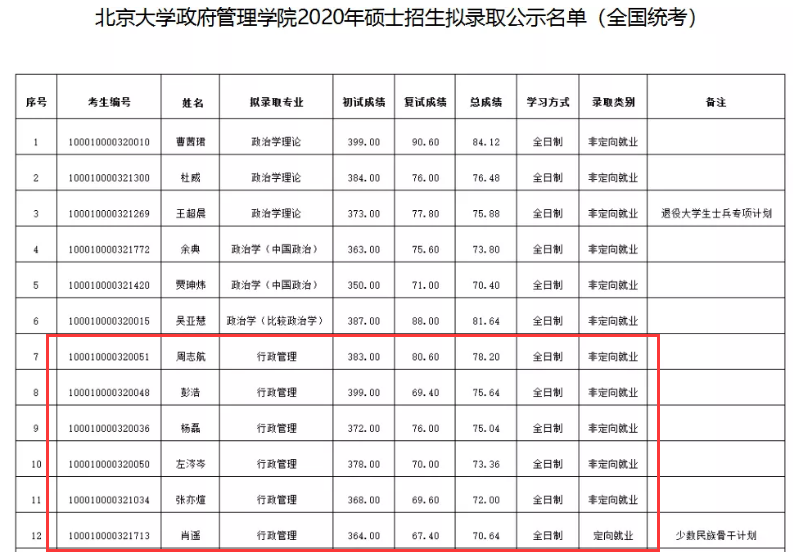 行政管理统考进入复试9人,录取6人,含少干1人,最低分368,最高分399