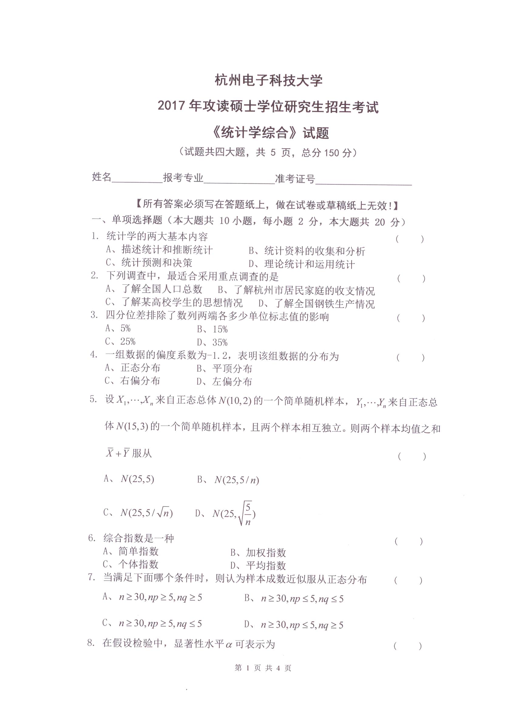 杭州电子科技大学考研辅导班:杭州电子科技大学2017年研究生招生考试统计学综合科目考试题目