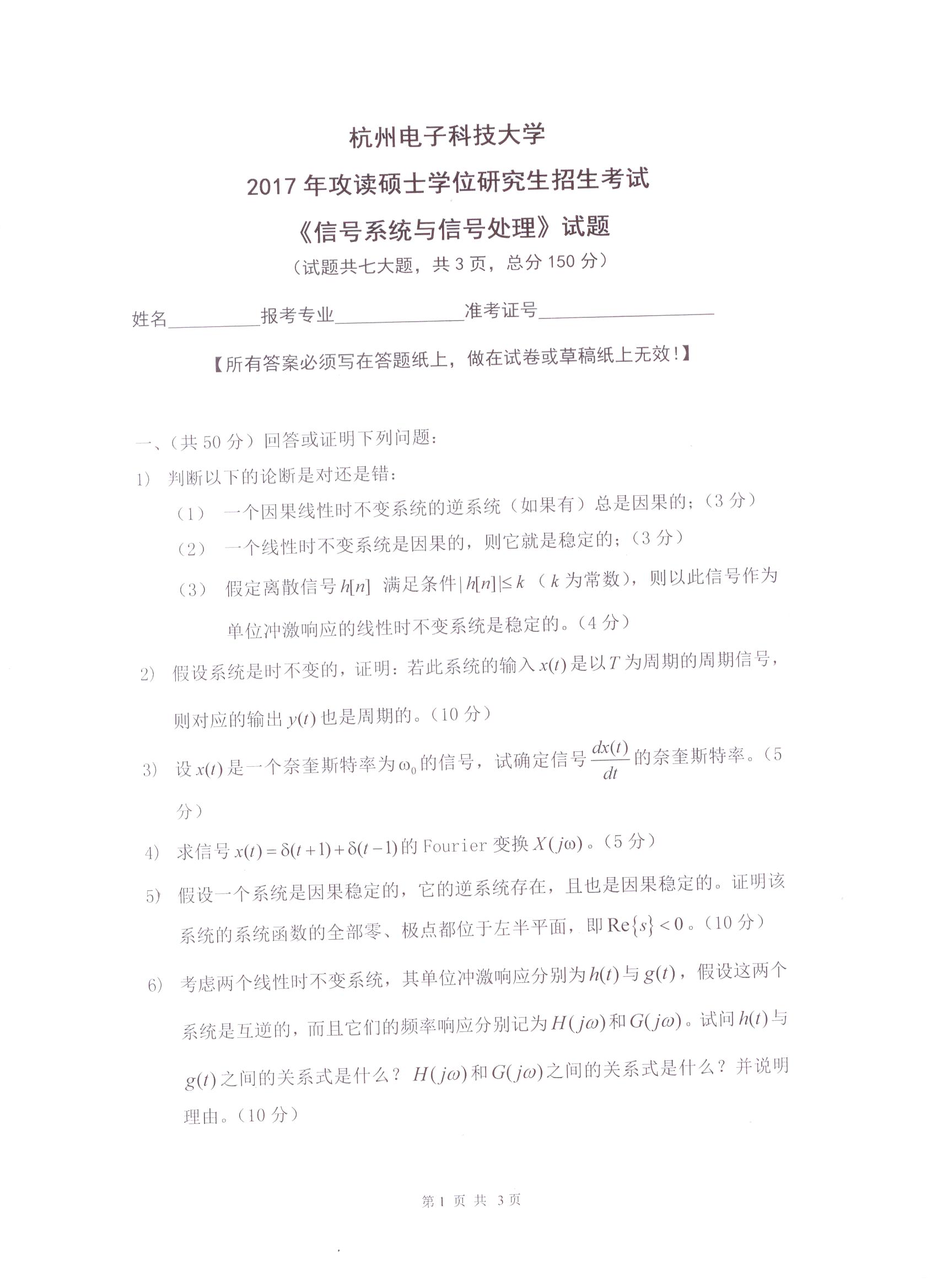 杭州电子科技大学考研辅导班:杭州电子科技大学2017年研究生招生考试信号系统与信号处理科目考试题目