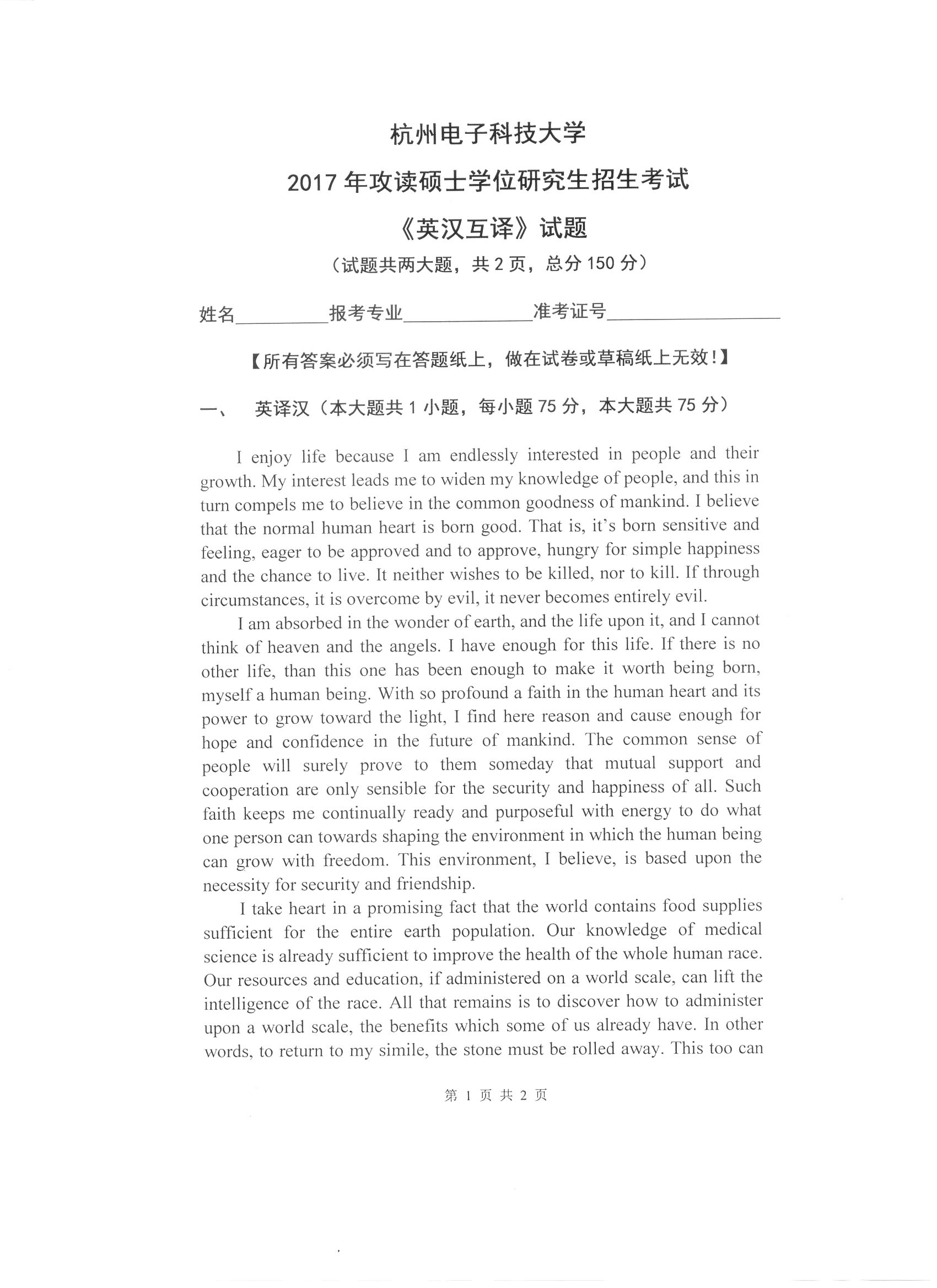 杭州电子科技大学考研辅导班:杭州电子科技大学2017年研究生招生考试英汉互译科目考试题目