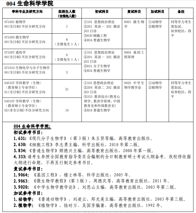 吉师大考研辅导班:吉林师范大学生命科学学院2021年硕士研究生招生专业目录及参考书目