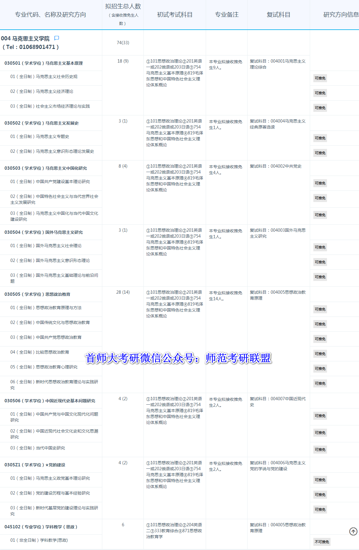 首师大考研辅导班:首都师范大学2021年硕士研究生马克思主义学院考研招生目录及招生人数公布
