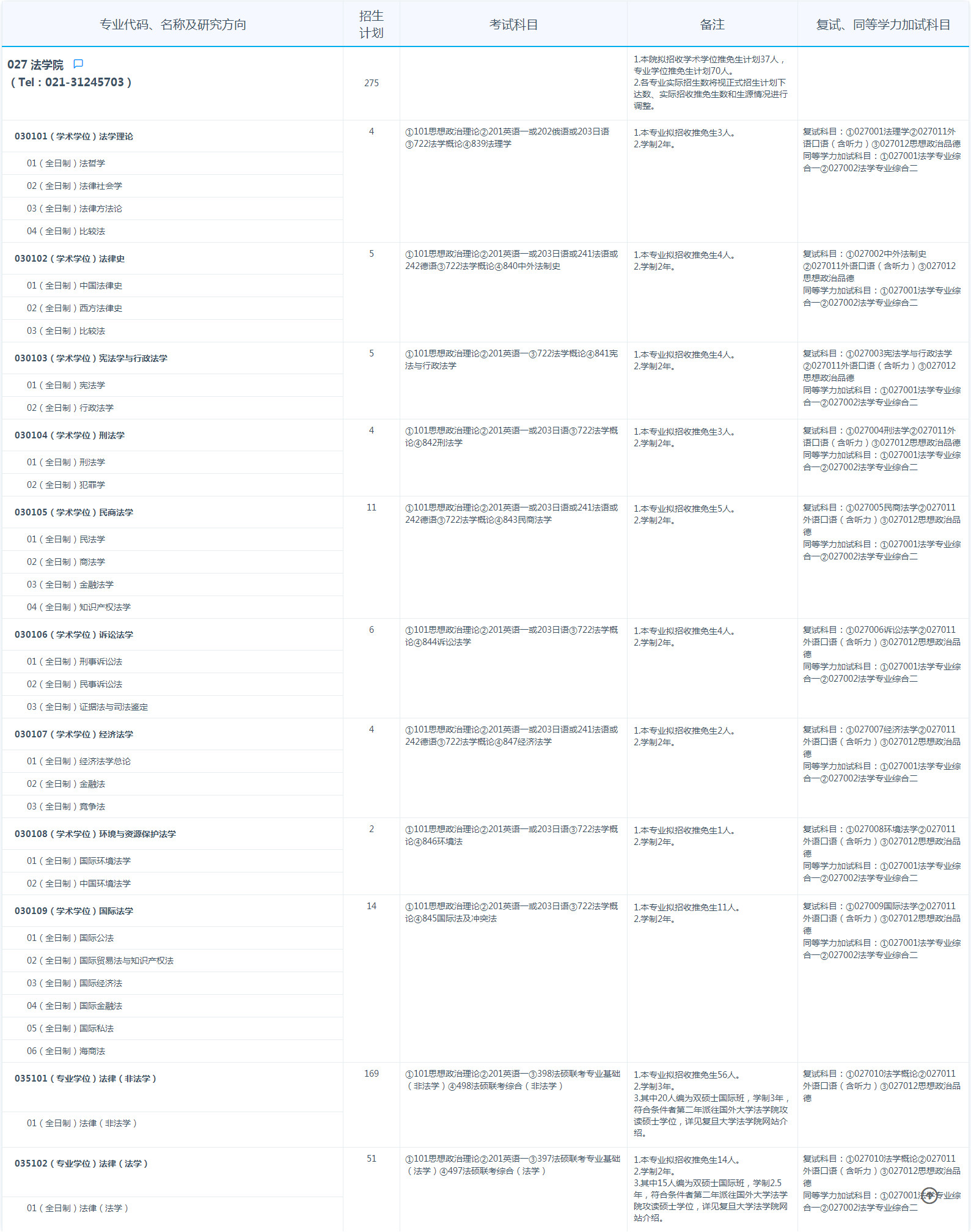 复旦大学考研辅导班:2021复旦大学法学院考研招生目录、招生人数、考试科目