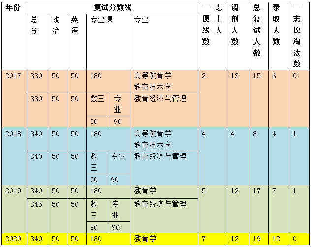 从上表可看出,教研院从一开始的分方向招生,逐步发展到了大方向招生,2020年有12个调剂生参加面试,但是有5个没有参与到最终的复试(因为已经被别的学院录取啦~)。同时可以看出,一志愿复试被刷的概率较小,2017年和2020年都是一志愿全部通过复试。