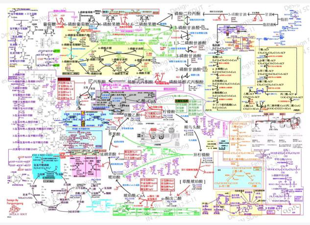 生化的复习我是在四月开始的,第一步就是要对整个课本的编排体系和内容做深入的了解,我的做法是在新祥旭找一个对口的学长学姐,跟着他们划的重点以及笔记看,再对着ppt来做笔记,每做完一章,就着手背,一定不要过完一遍书才开始背诵,因为你会发现,这本书你就像是没有看过一样生疏!所以一定要趁热打铁,每看完一章节,或者一个模块(比如看完糖类或者看完蛋白质)就着手背诵,不要怕慢,慢功夫才能出细活!生化上册主要就是在讲糖类,脂类,蛋白质,核酸这四种物质以及一些分离纯化他们的技术,所以比较基础,也比较零散,按照五大模块一步步复习,你就可以有目标有方向,而不会觉得这么一本厚书该从何下手。下册主要是在讲代谢,糖代谢,脂类代谢,蛋白质代谢,核酸代谢,与上册相呼应,当然还有部分细胞整体代谢的内容,这就需要你有足够的逻辑性,我的做法是自己整理笔记,整理代谢途径,用彩色的笔进行绘图,这样下来,可以把整个下册的内容归结为一整张图(类似下图)如果有需要的可以在新祥旭找我辅导,上课的时候我带你们做,时间不够也可以给你们。