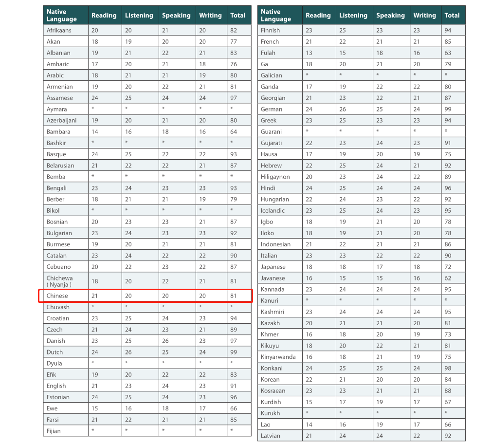 从2020年9月ETS发布的《2019年全球托福分数报告》中的数据显示,2019年中国内地托福考生的平均分再提高1分,达到81分,从图中我们可以看到,中国托福阅读21分,听力20分,口语20分,作文20分,在全球考生中的排名不容乐观,托福分数达到80分,只能超过全球38%的学生。而亚洲地区托福分数最高的三个地区分别为:新加坡:平均分98分、印度:平均分95分、巴基斯坦:平均分94分。