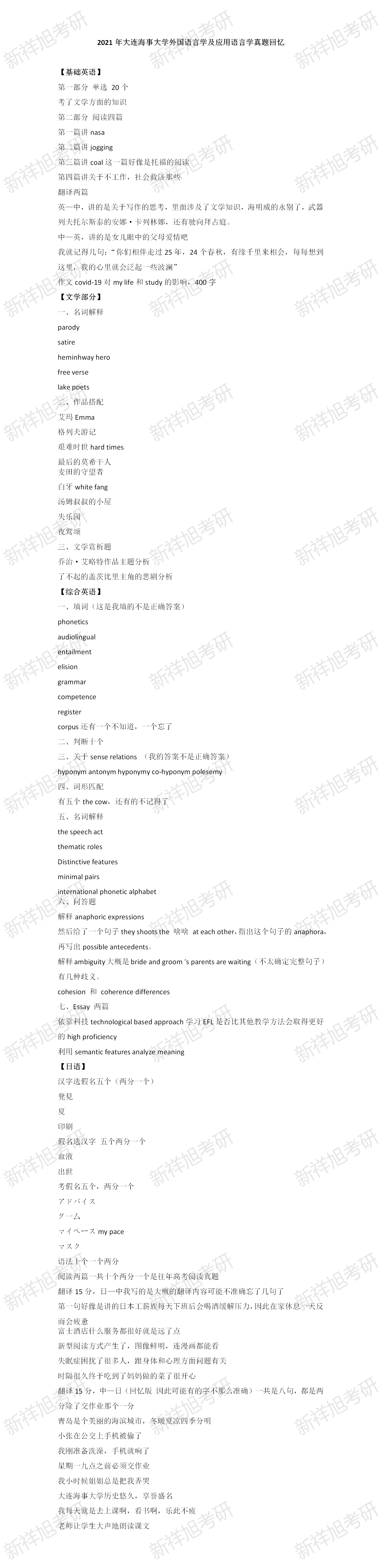 新祥旭考研:2021年大连海事大学外国语言学及应用语言学真题回忆