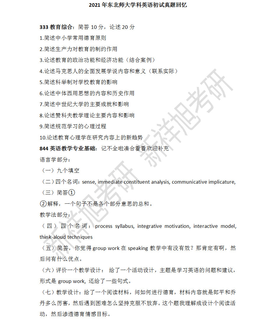 新祥旭考研:2021年东北师范大学学科英语初试真题回忆