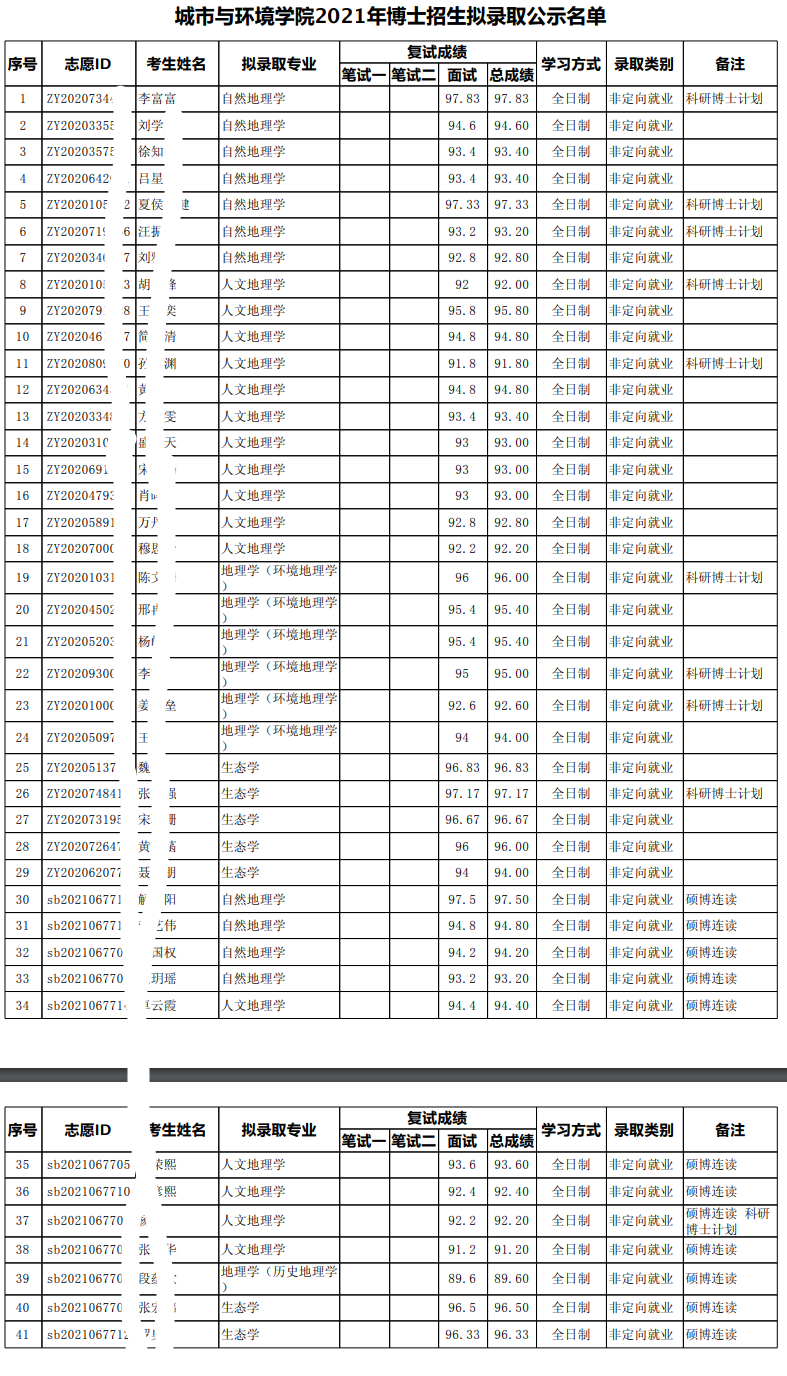 北京大学2021年城市与环境学院博士研究生招生拟录取公示名单
