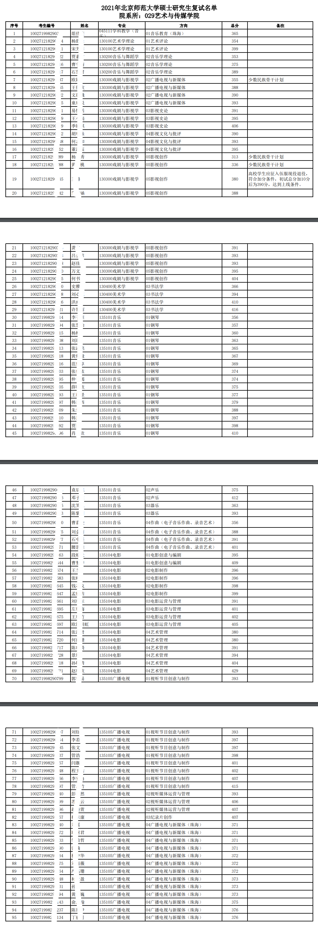 2021年北师大艺术与传媒学院硕士研究生考研一志愿复试复试名单公布