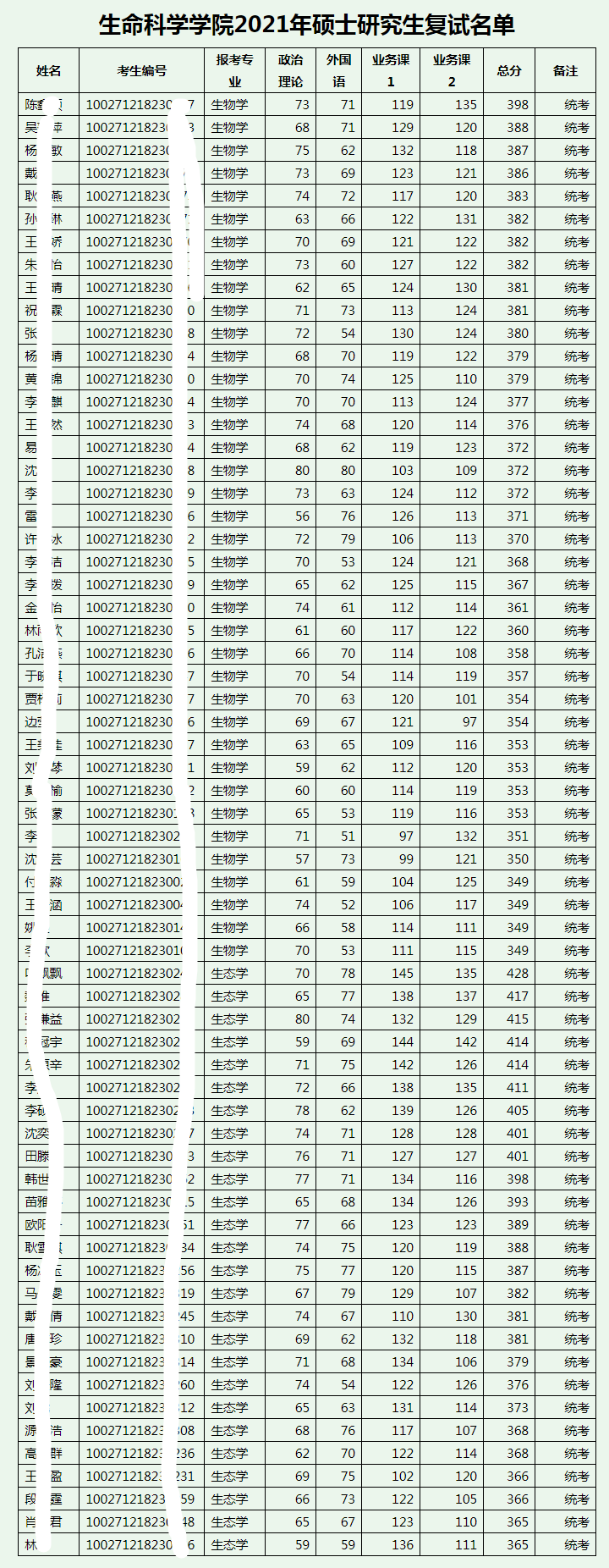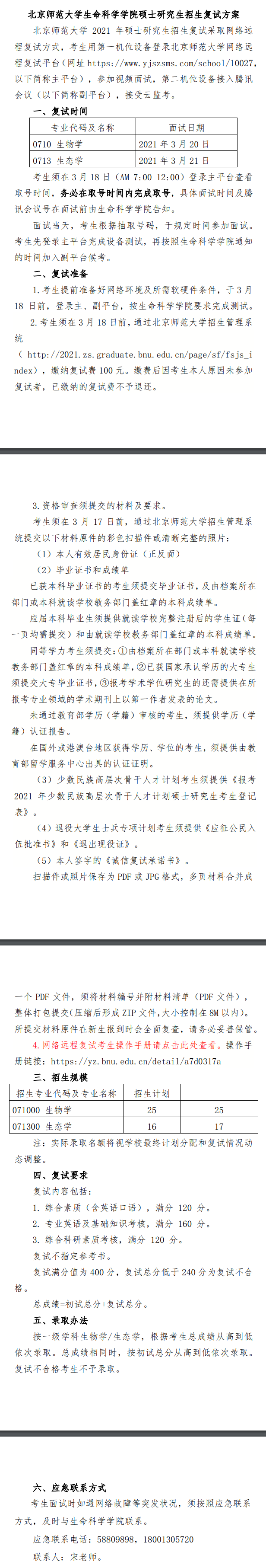 2021年北师大生命科学学院考研复试要求、复试名单等方案细则