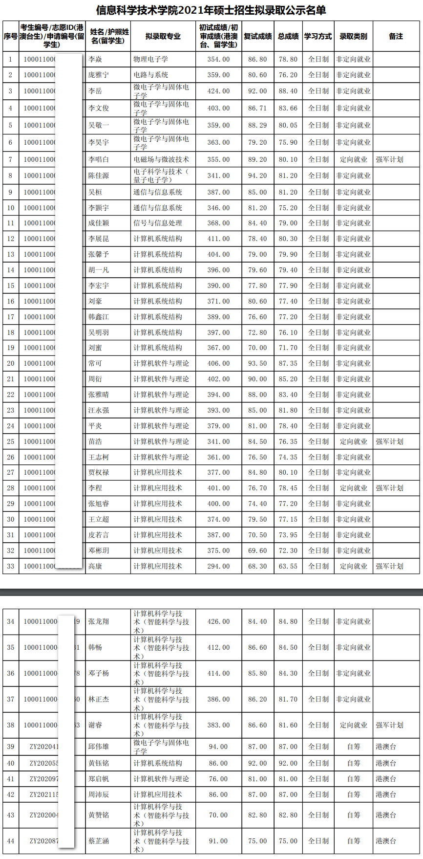 2021年北京大学信息科学技术学院硕士招生拟录取名单公示