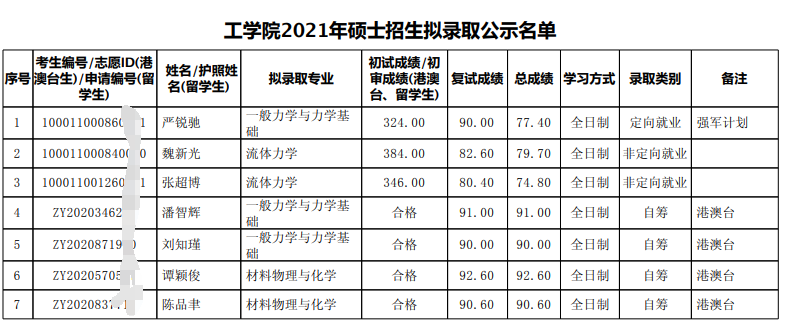 2021年北京大学工学院硕士研究生招生拟录取名单公示(学术型)
