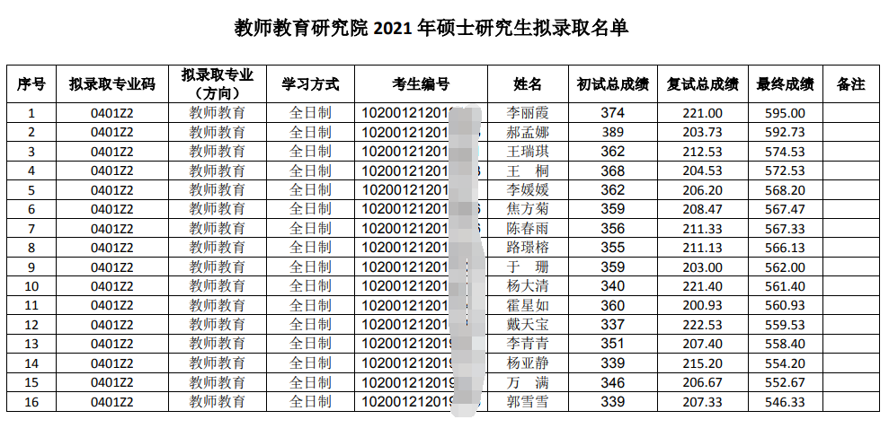 2021年东北师范大学教师教育研究院硕士研究生拟录取名单