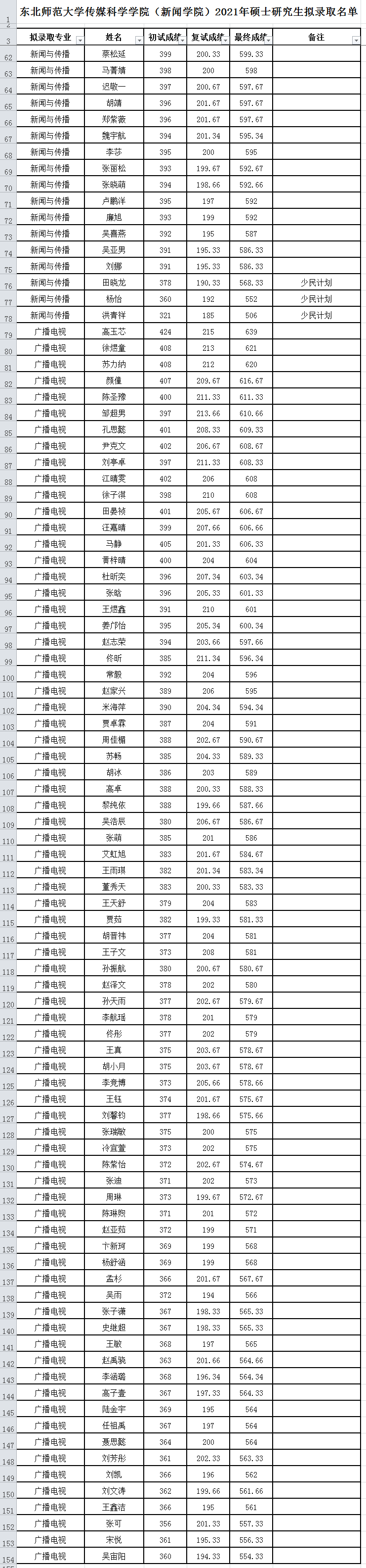2021年东北师范大学新闻学院考研拟录取名单公示