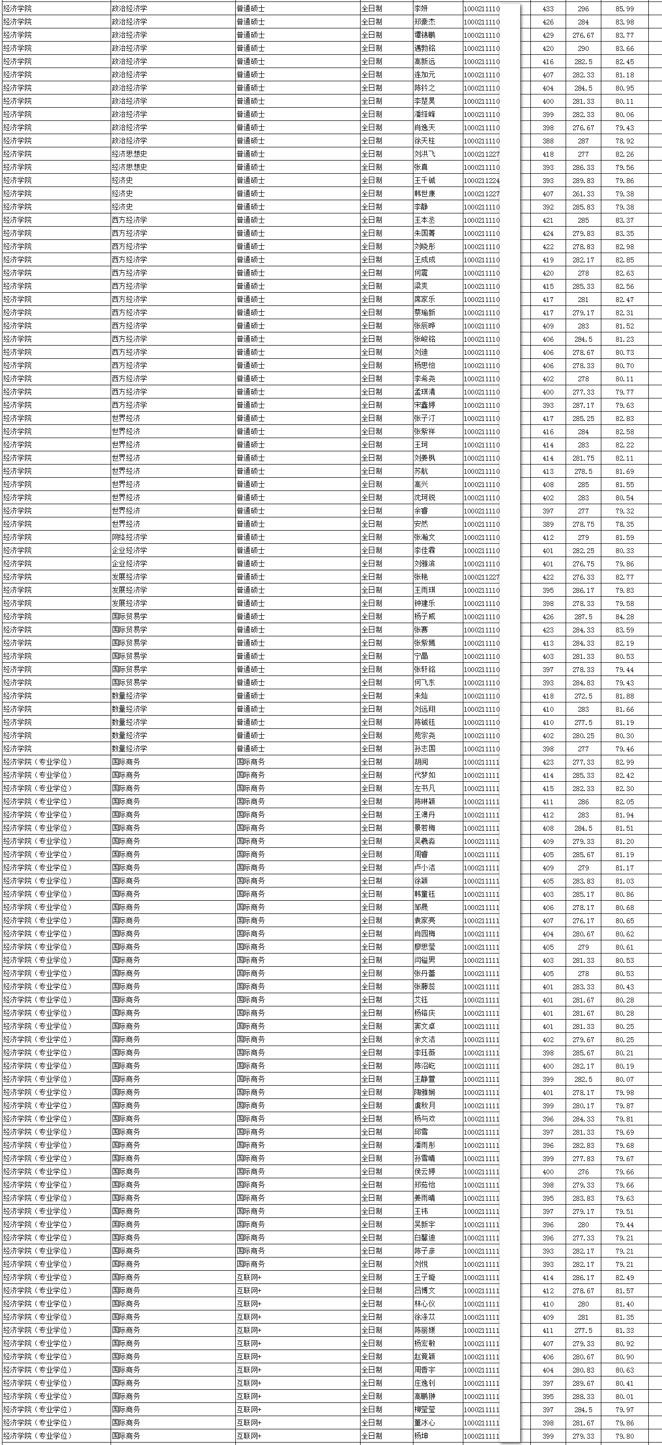 2021年中国人民大学经济学院全国硕士研究生招生拟录取名单