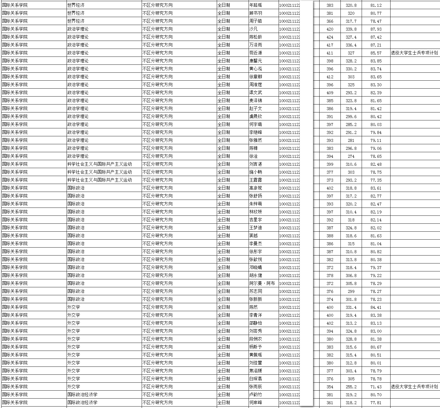 2021年中国人民大学国际关系学院全国硕士研究生招生拟录取名单