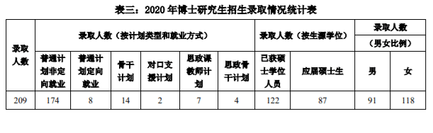 2020 年我校招收博士研究生 209 名,学习方式均为全日制,招生方式分为 普通招考、硕博连读、申请考核三类,相比 2019 年增长 8.3%。其中普通招考生 120 名,硕博连读生 45 名,申请考核生 44 名。普通招考共有 936 名考生报考, 其中包括专项计划-少数民族高层次骨干人才计划考生 77 人报考,专项计划-对 口支援计划 26 人报考,专项计划-高校思想政治骨干在职攻读博士学位专项计划 26 人报考,2020 年博士研究生报名录取情况详见表三和表四。