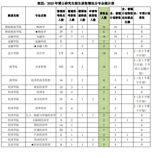 表四:2020 年博士研究生招生录取情况分专业统计表