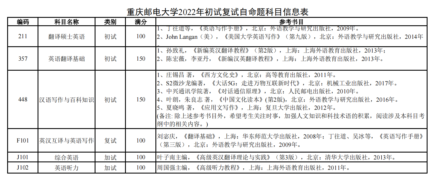 重庆邮电大学考研辅导班:2022年重庆大学外国语学院硕士研究生考试科目及参考书目
