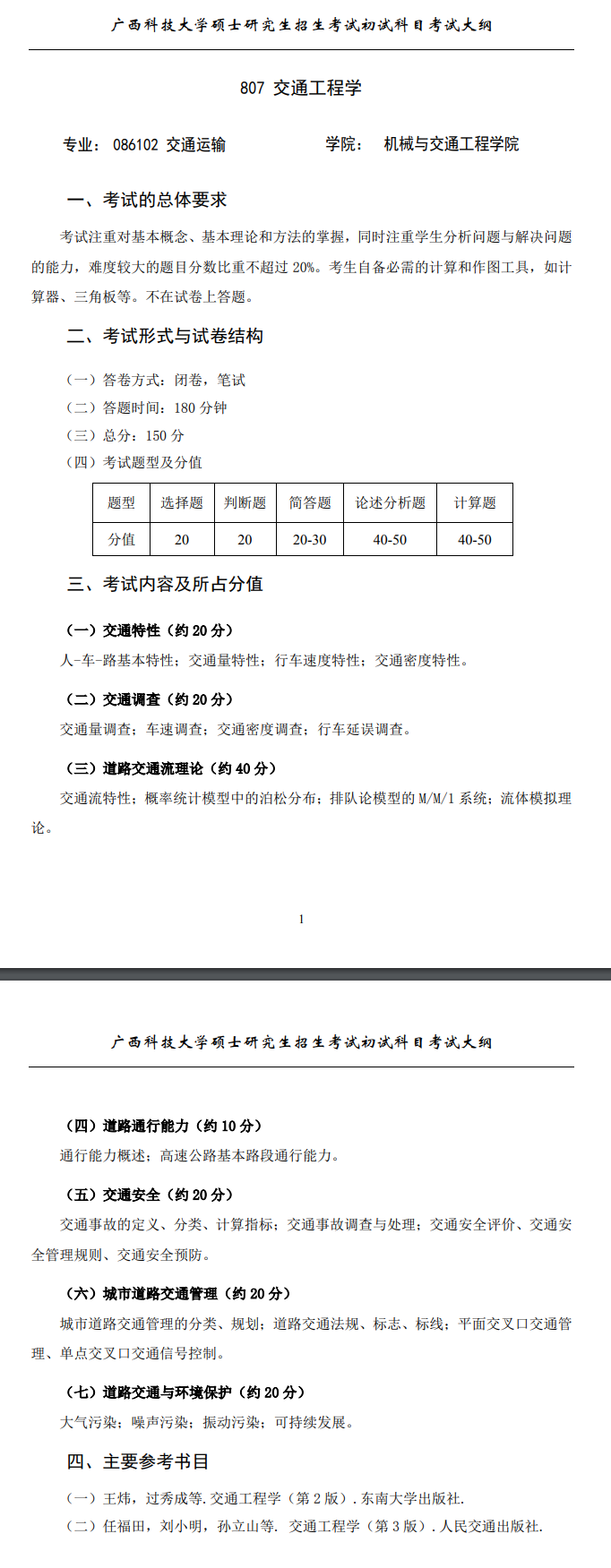 广西科技大学考研辅导班:2022年广西科技大学道路交通运输专业考研招生目录、807交通工程学考试大纲、参考书目