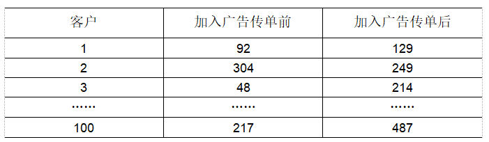 计算分析题:一家电话公司制订出一个广告计划,以增加客户长途电话的通话时间。为了解该计划的优点,公司对其进行小规模推广试验,他们从推广目标客户中随机抽取100位客户作为样本,并记录这100位客户在过去一个月长途电话的通话时间,然后公司在接下来的一个月里,在给用户的声明中加上一份特殊的广告传单,然后再记下这些客户该月的通话时间,数据如下表所示(分钟)。