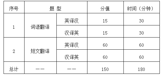 考试的内容包括词汇、短文的英汉互译。具体为:1、词语翻译,包括英汉双语中的热点词语;常用习语、成语、谚语;术语及专有名词;常被引用的诗词或名人名言等;2、短文翻译,题材涉及医学、科技、经贸、人文等。
