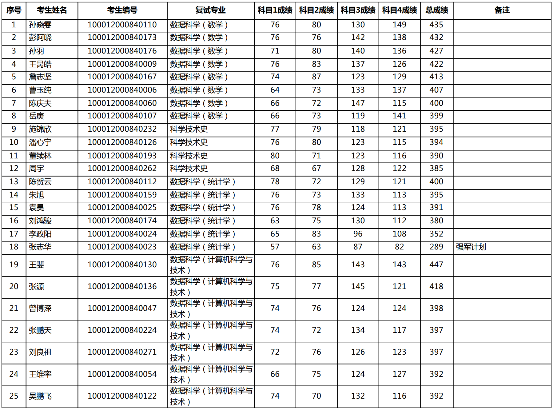 按照北京大学前沿交叉学科研究院各招生专业的招生计划和初试成绩,我院确定的复试分数线为: